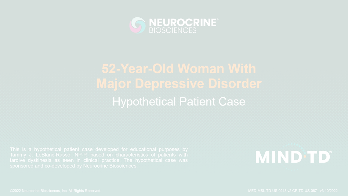 This is a hypothetical patient case developed for educational purposes by Tammy J. LeBlanc-Russo, NP-P, based on characteristics of patients with tardive dyskinesia as seen in clinical practice. The hypothetical case was sponsored and co-developed by Neurocrine Biosciences.